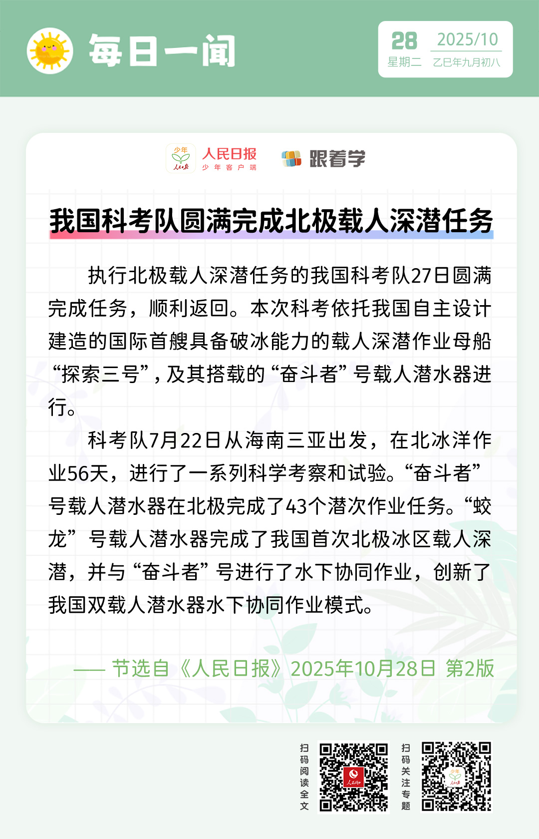 每日一闻丨我国科考队圆满完成北极载人深潜任务