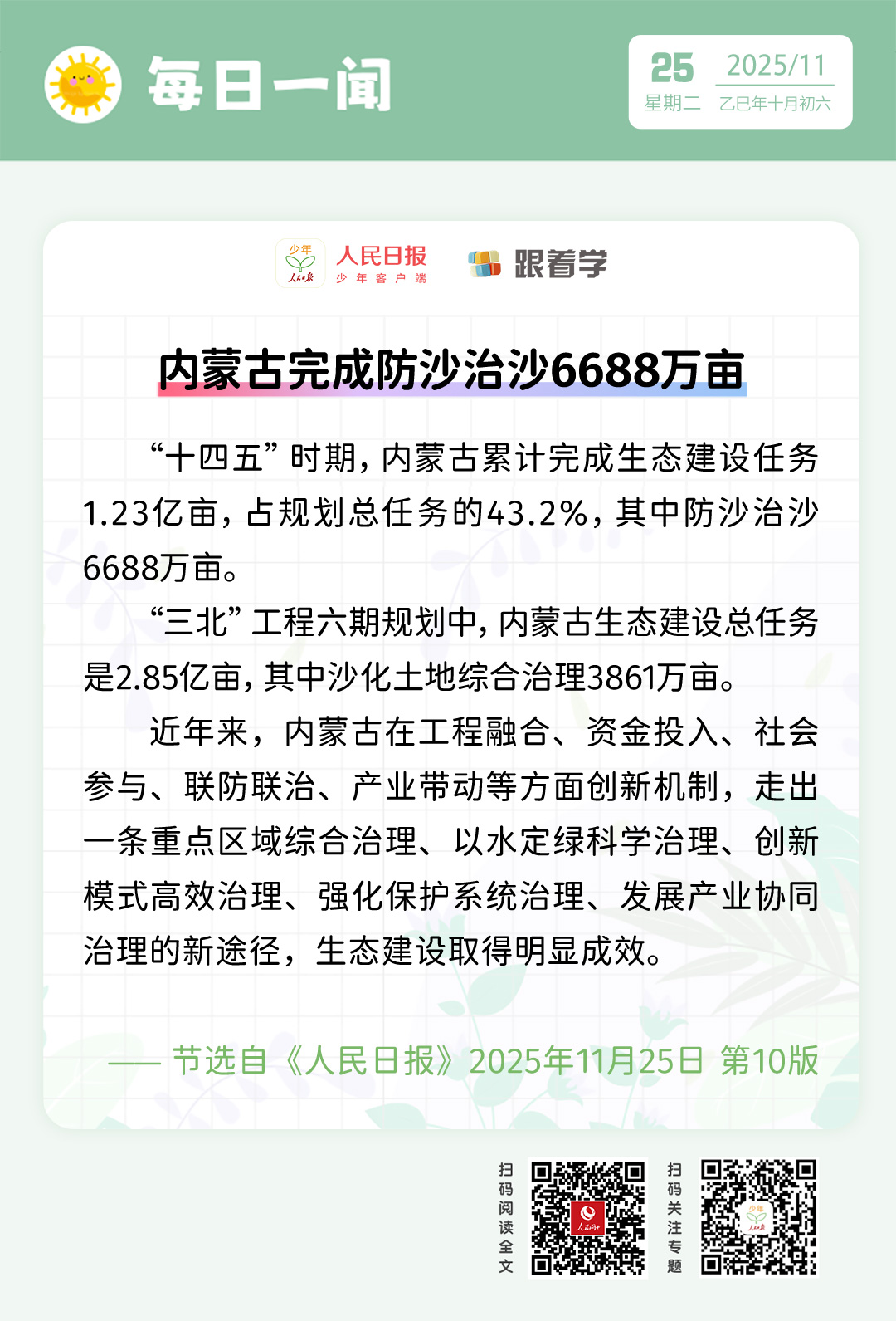 每日一闻丨内蒙古完成防沙治沙6688万亩